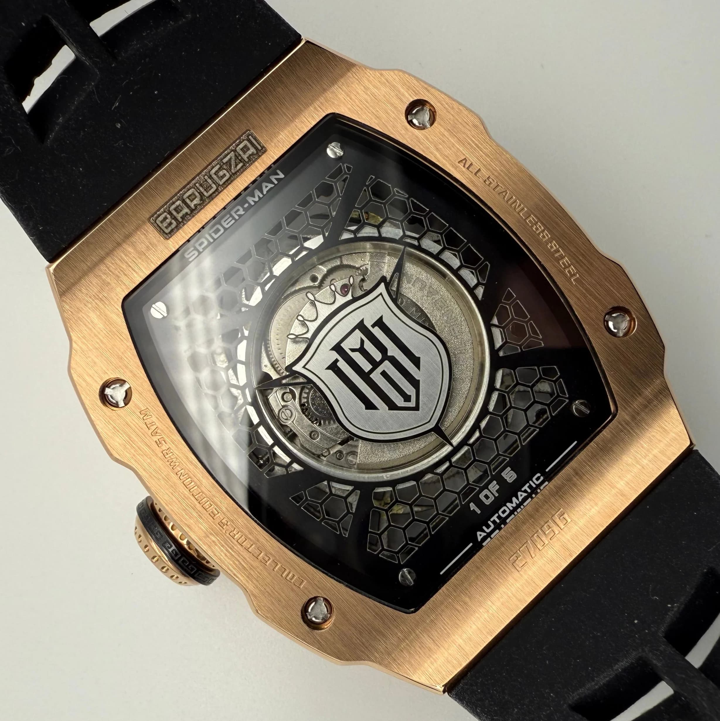 Each watch in this limited edition series features a fully customised engraved case back. Inspired by the shape and iconography of the Barugzai emblem, we created a new design element exclusive to this project. Every unit is individually numbered, reinforcing the exclusivity of the collection and giving each timepiece a unique identity. This detail serves both a technical and symbolic role in establishing the watch as a collector's piece.